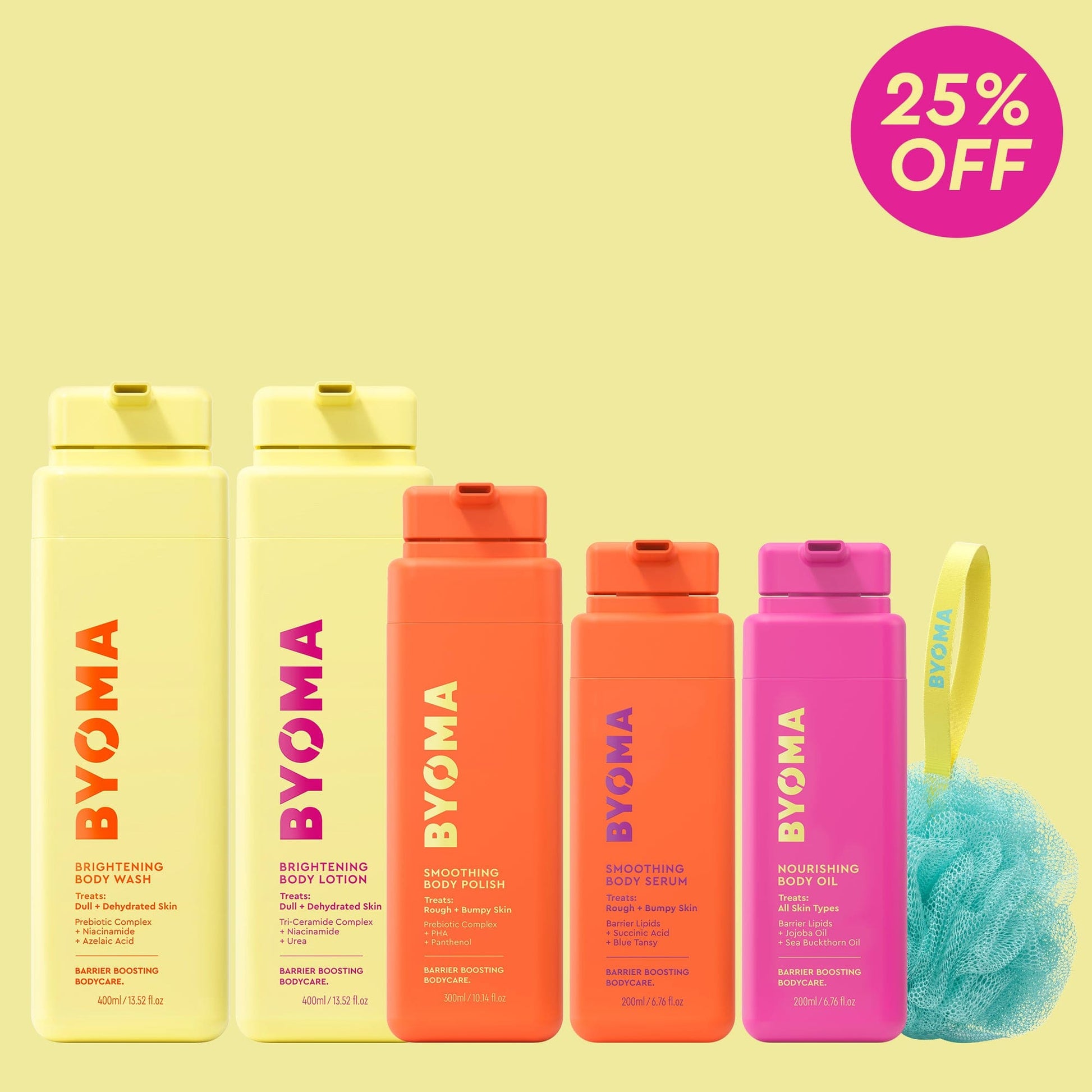 Meet your ultimate body care routine for clinically proven brighter skin & your favourite BYOMA barrier boosting benefits, below the neck.