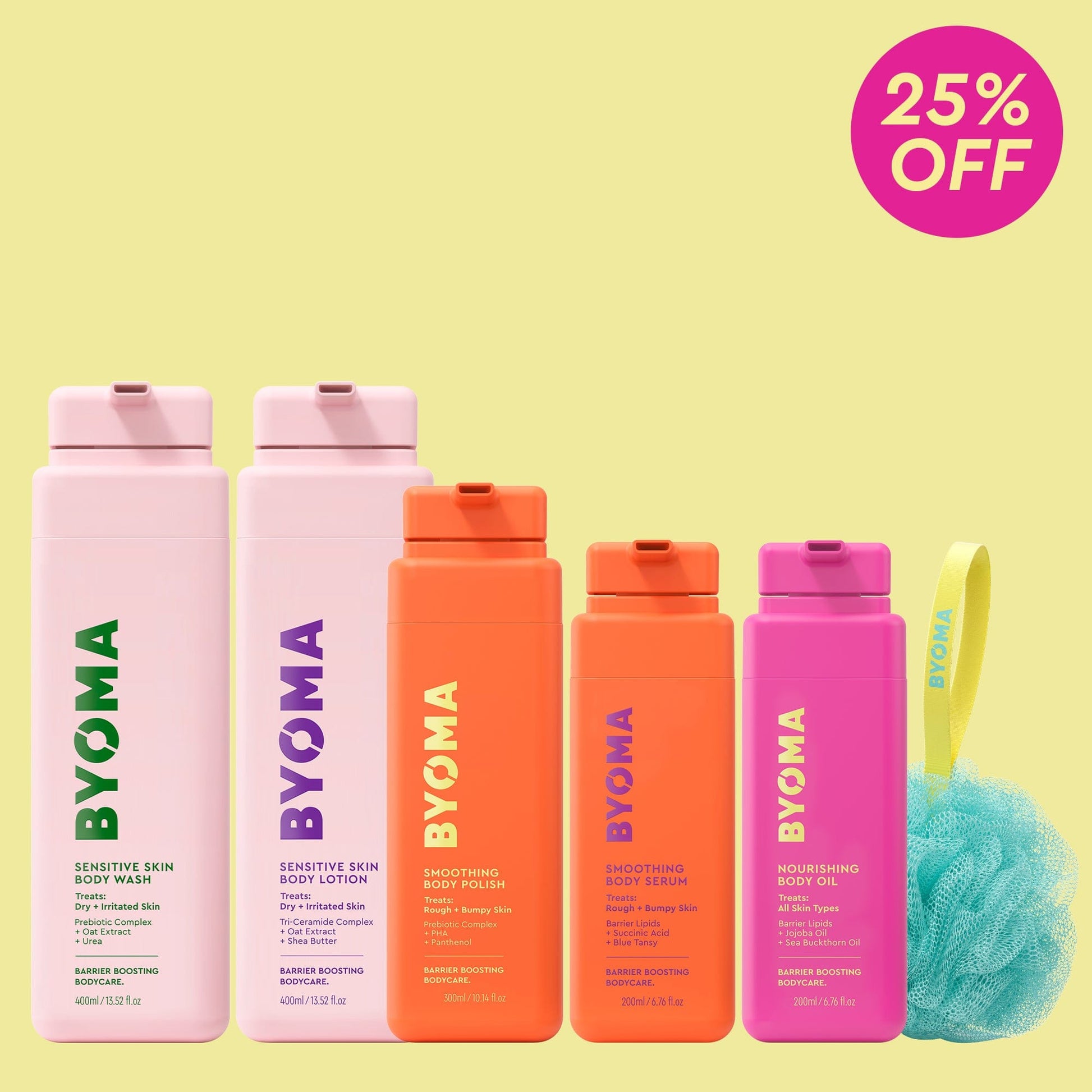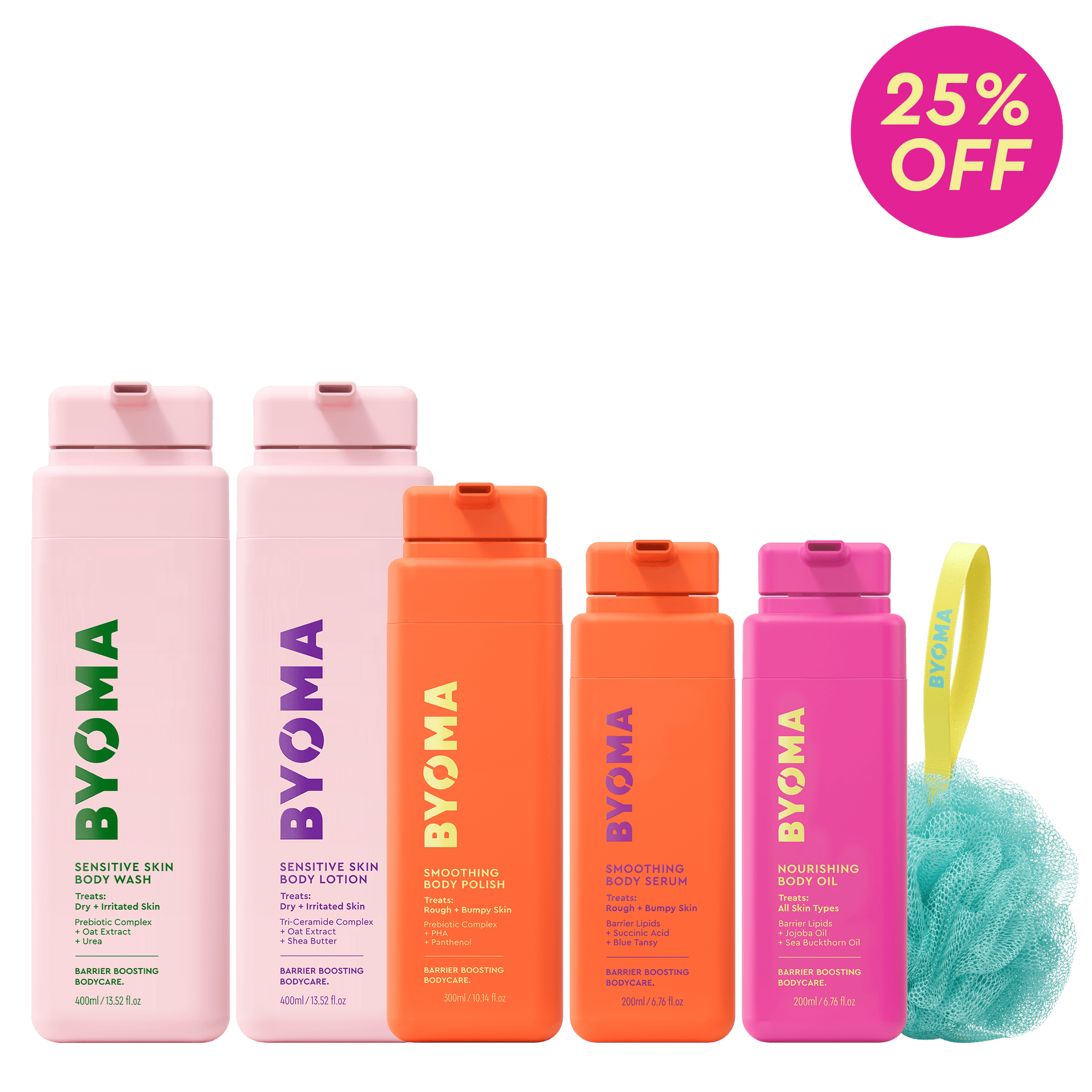 Includes 5 full size products + exclusive BYOMA shower puff